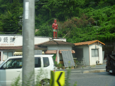 さーて帰りましょうと帰路についていた時、遠くに見える民家の屋根の上になんだか大きな人影を発見!